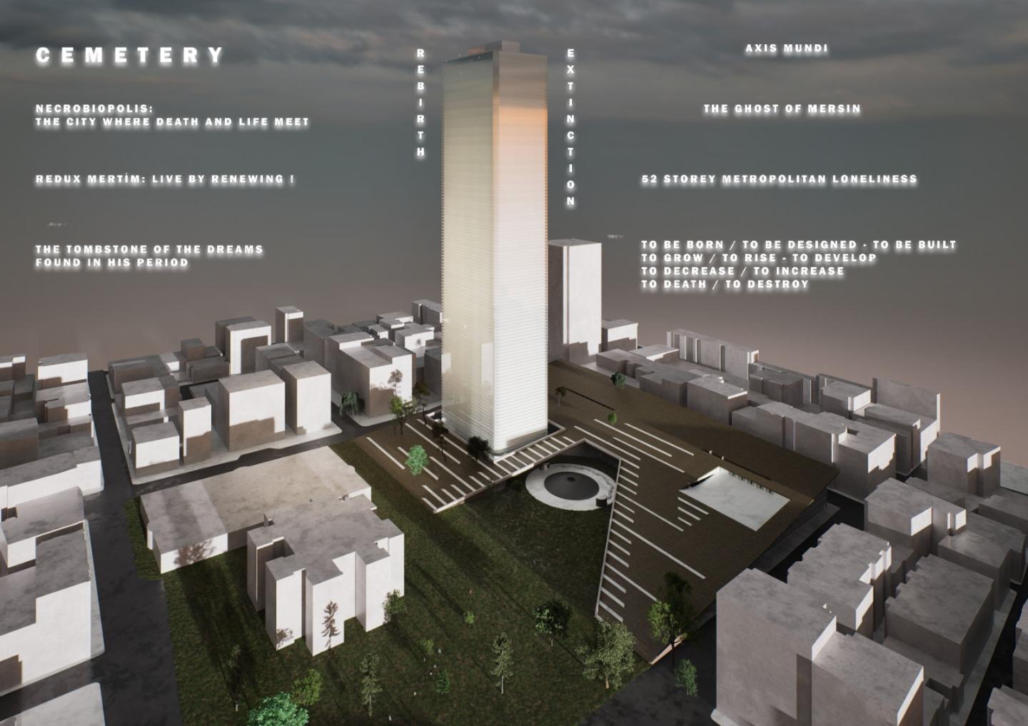 Mertim, the ghost of Mersin, rises as a 52-story monument to metropolitan solitude. Once erected with grand ambitions, this now-abandoned structure has become its own gravestone. This project transforms death from a horizontal concept into a vertical one—constructing a metaphor that ascends into the sky. The skyscraper becomes an Axis Mundi, a conduit toward the divine, publicizing the repressed image of death through architecture.