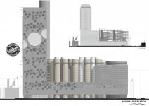 On the installation ‘Turning the Place Over’ by Richard Wilson, which is the same language as cylinder tubes on the facade in 2007, I adopted a facade language in which circular spaces are opened on the existing facade. I aimed to create a composition where the cylinder tubes are interrupted by floor tiles where they shoot out from the facade.