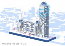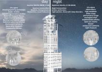 At the Root level, the design embeds collective memory and production: a public bazaar, ateliers, workshops, art studios, and a research library anchor the project in civic history. The Threshold acts as a spatial agora between city and structure, hosting concerts, exhibitions, and seminars that flow between day and night. The Sprout layer, housed in the tower's upper zones, carries the building into the future with observatories, experimental stages, and “sky meadows”—a symbolic inversion where earth is brought to the sky.
