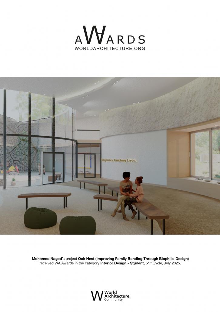 Oak Nest (Improving Family Bonding Through Biophilic Design (Family Community Center) El-shiekh Zayed, Giza, Egypt) by Mohamed Naged in Egypt won the WA Award Cycle 51. Please find below the WA Award poster for this project.
