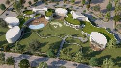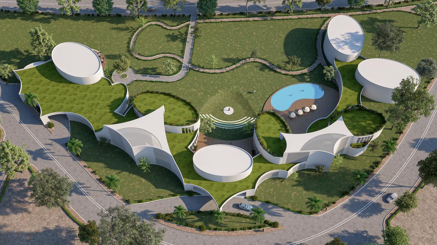 All the facilities including sports spaces, a gymnasium, a pool, restaurants, a yoga center, a theatre & community halls are organically laid out along the southern perimeter of the site.