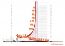 In place of the removed wall, a contemporary steel structural system was introduced. The structural form, composed of steel trusses, was specifically designed to distribute the load in a way that reduces pressure on the ground. This intervention not only provides a technically integrated solution but also enables the formation of a public green topography that remains accessible and active at all times. In doing so, it addresses a common issue associated with high-rise buildings—their tendency to become inactive and lifeless after dark—by cultivating a continuous and dynamic public experience.