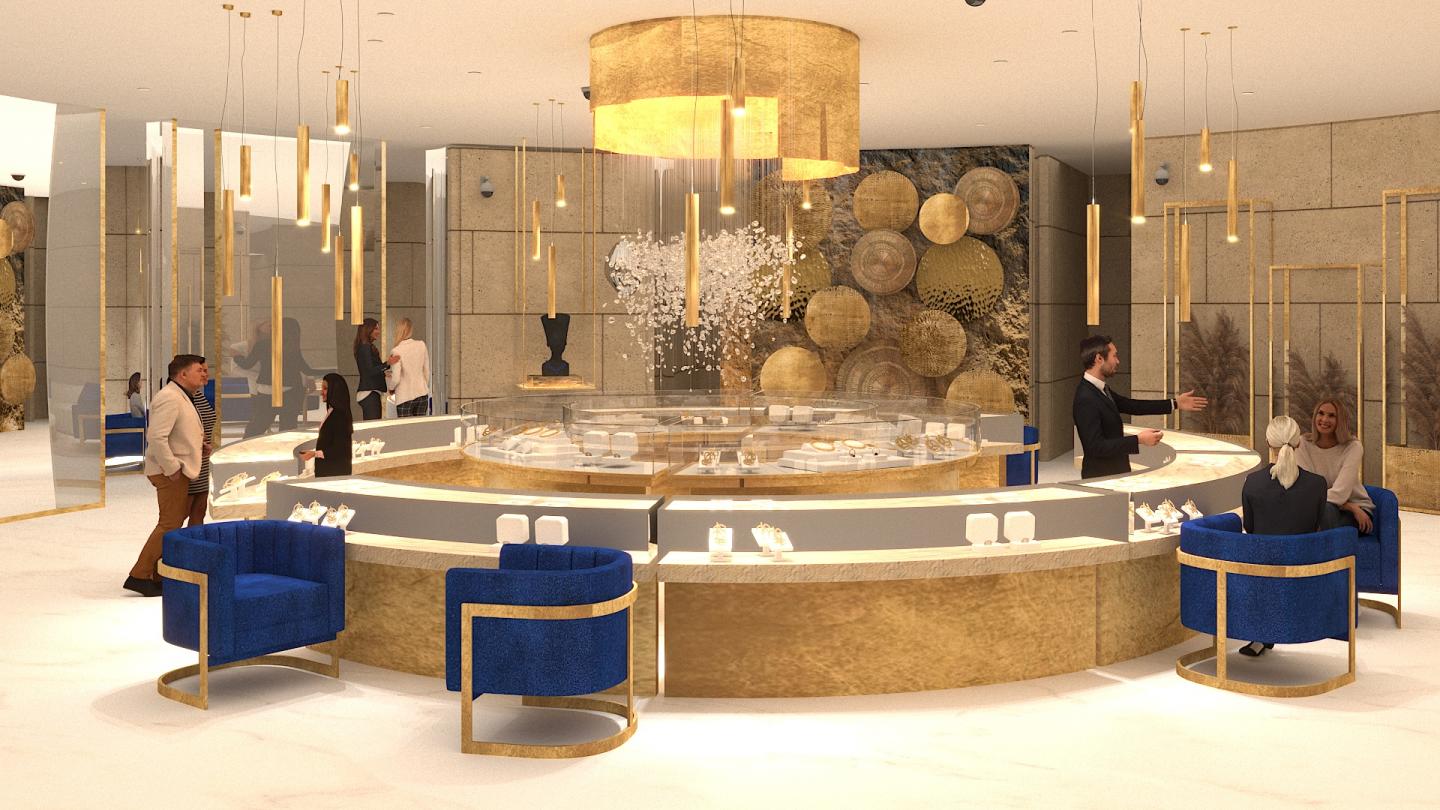This zone is where commerce meets curation. Designed as a luxury retail environment, it allows contemporary Egyptian jewelry brands to showcase their work in a setting that reflects their craftsmanship and identity. The retail shop features modular displays, anti-reflective glass cases, and custom lighting optimized to enhance the brilliance of each piece. Storytelling is embedded into the retail experience through interactive tags that share details about the designer, inspiration, and making process. The retail shop balances elegance with accessibility, encouraging both admiration and purchase. The material palette continues the warm, gold-inspired tones, creating a cohesive identity across all zones.