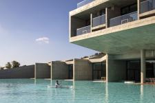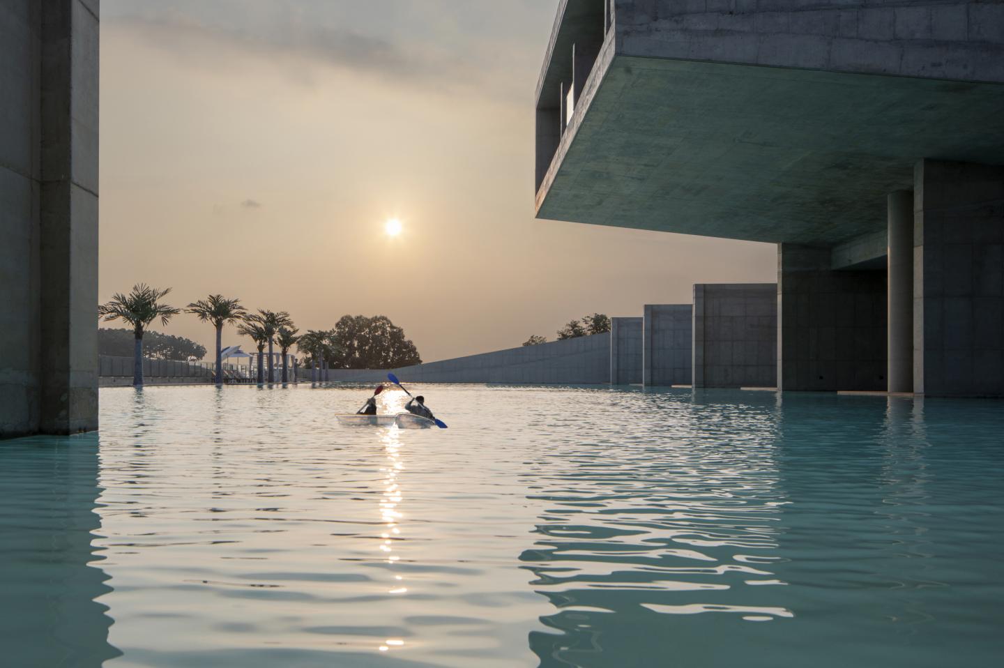 At the junction where the reception hall and guest circulation diverge on the first floor, a “dock” serves as the gateway absorbed into the water realm. This space functions as a room of light, where water, illumination, the flow of time, and human movement converge. The second-floor lounge acts as the central node connecting the entire resort, with a 3.5-meter wide staircase linking the first-floor reception hall to the third-floor infinity pool via an outdoor stair. On the third floor, cantilevers project in three directions. The individual lodging units and lounge organically connect, providing easy vertical access. The cantilevered pool facing the West Sea captures the sunset, while the southern cantilever mass floats above the water basin, expanding the perspective toward the surrounding farmland.