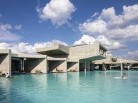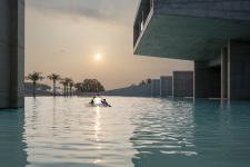 The expanded grounds contain a water basin. The water transcends decorative function, serving as a medium that generates its own unique landscape and facilitates diverse activities. Enclosed by architecture, the waterfront is an intentional void—a space filled both physically and symbolically by water, carrying a layered significance of sanctity and play. Standing here, you encounter the raw presence of the brutalist concrete structure, seemingly floating upon water. The concrete is unapologetic and honest, expressing the material “as found.” The interplay between the underwater dwellings and the massive concrete masses above produces a complex urban-like landscape. Light and shadow move across surfaces and spaces, while the reflections of sky and the silhouettes of people walking above the water complete the notion of an “internalized landscape” (paysage intérieur).