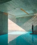 Entering the building, visitors proceed through a thick piloti space horizontally pierced, leading to a deeply recessed central courtyard (light well). This courtyard is the core of organic movement, acting as a milieu where arrivals and departures, indoor and outdoor experiences, time and activity all intertwine. Heavy concrete walls and floors, intersected by light and shadow, layer with glass and reflective water to stimulate the senses on multiple levels. Varied routes and spatial experiences in the courtyard connect, like woven fibers, into an integrated collective whole.
