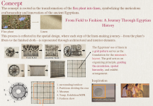 This project responds to the lack of platforms dedicated to showcasing the significance of Egyptian fashion, particularly the historical value of textiles like linen. It aims to educate and inspire while preserving traditional craftsmanship and highlighting the artistry embedded in Egypt’s fashion evolution. The museum is not just a static exhibition space but a dynamic, living archive that encourages cultural exchange and fashion tourism. Through curated storytelling, sensory elements, and thoughtfully designed environments, the museum will foster pride in Egypt’s cultural legacy while positioning it within a global fashion context—bridging history and innovation in a meaningful, lasting way.