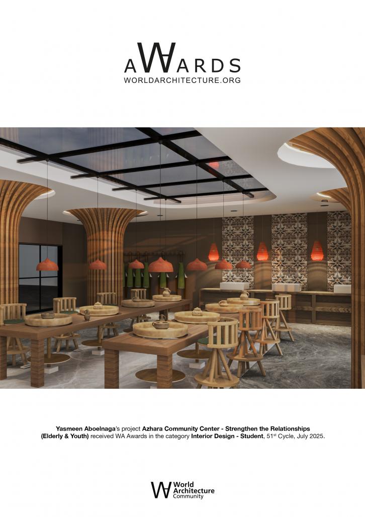 Azhara Community Center- Strengthen the Relationships ( Elderly & Youth) Through a Biophilic Design of A community center by Yasmeen Aboelnaga in Egypt won the WA Award Cycle 51. Please find below the WA Award poster for this project.