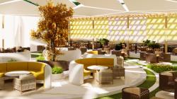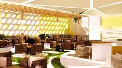 Materials: High-quality, comfortable materials will be used to create a welcoming atmosphere. This could include soft, durable upholstery for the lounge seating, perhaps in shades that reflect the colors of the sunflower (yellow, orange, and brown). Natural marble accents on the furniture and wall decorations will add a touch of warmth and luxury. Large-format tiles or flooring can be used to define areas of high traffic.