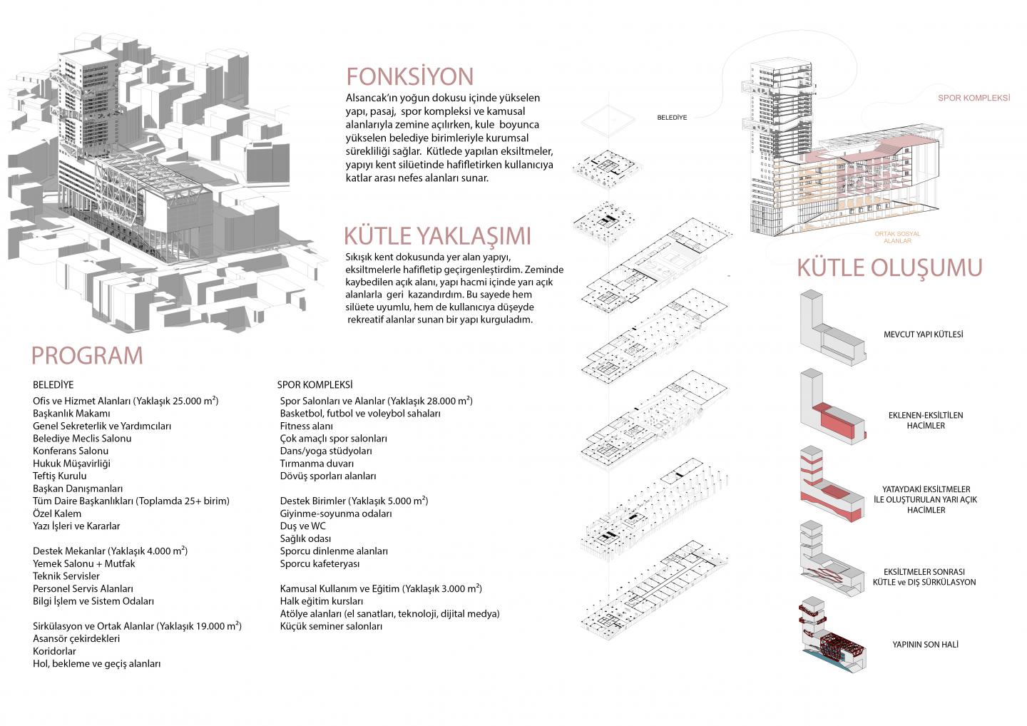 The core idea of the project revolves around revitalization through dual-functionality. The structure is divided into two primary zones: the tower (upper section), which accommodates municipal services, and the base (lower podium), which is redesigned as a vibrant sports and cultural complex. This strategic distribution of functions allows for a diverse user base, activating the building throughout the day with various flows of people, from public servants to students, athletes, and visitors.