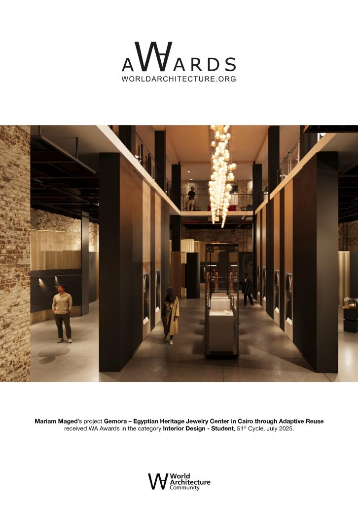 Gemora – Egyptian Heritage Jewelry Center in Cairo through Adaptive Reuse (The factory) by Mariam Maged in Egypt won the WA Award Cycle 51. Please find below the WA Award poster for this project.