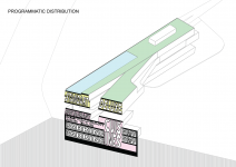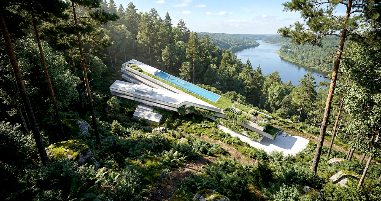Programmatic spaces are arranged vertically in direct response to gravity, access, and privacy. Service areas and parking are carved into the hillside, forming a grounded base that anchors the structure and supports public and semi private functions above. As the building rises, the architecture gradually lifts away from the earth. The main accommodation levels float over the landscape, offering uninterrupted visual connections to the surrounding forest and horizon, reinforcing a sense of retreat, suspension, and detachment from the ground.