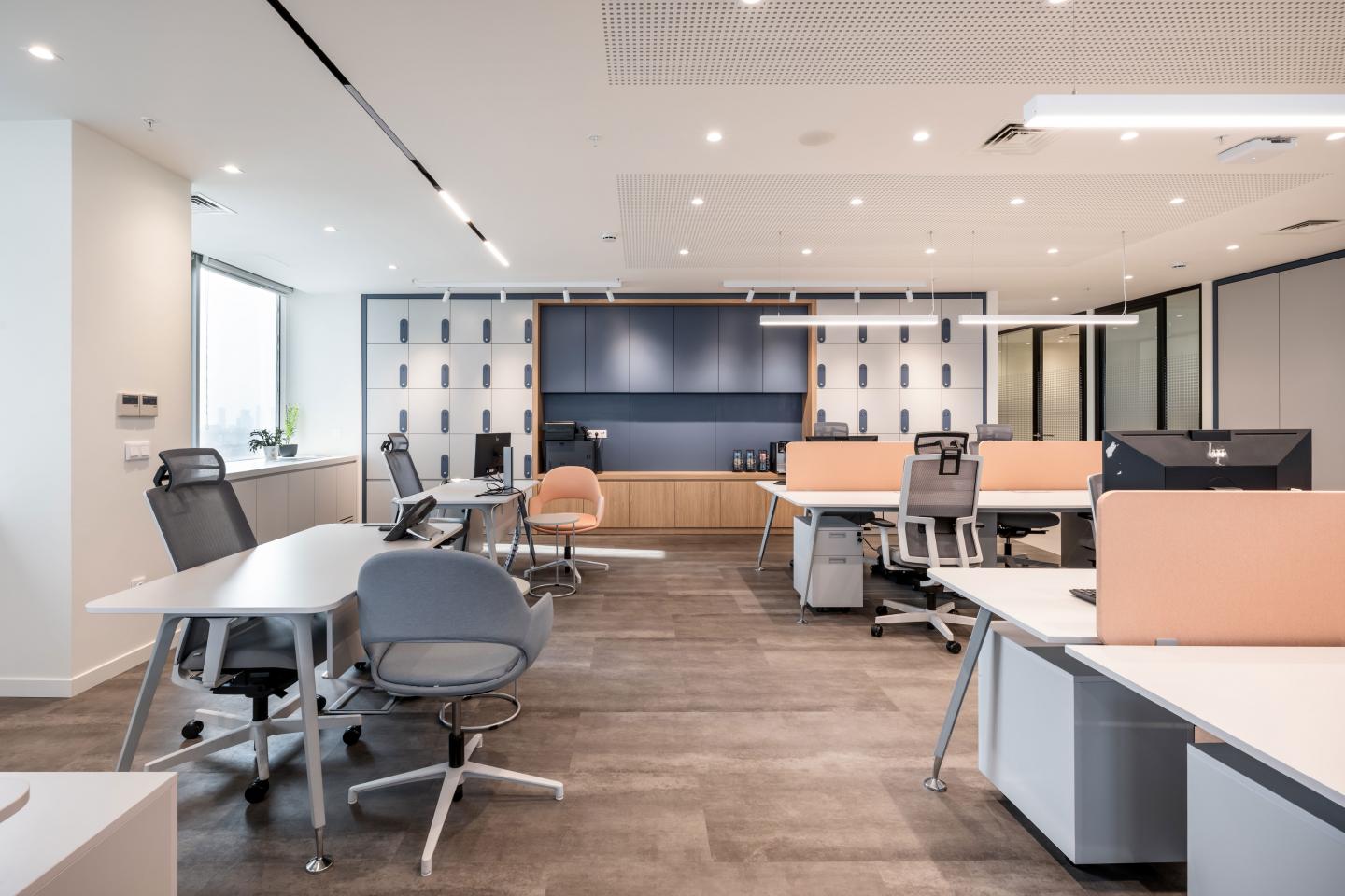 A unit combining the shared printer point, coffee station, and personal lockers is conceived as a “stop” at the heart of the office, acting as a contact node that encourages social interaction.
