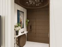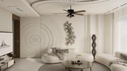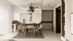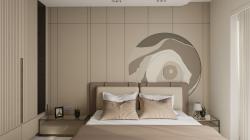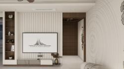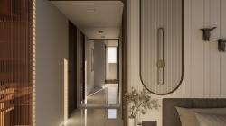 The material palette is grounded in warm neutrals and layered textures, establishing a sense of warmth and serenity. Custom wall paneling with subtle geometric articulation adds depth and nuance without overwhelming the senses. Bespoke ceilings and refined joinery complement the spatial aesthetics while responding to functional needs, enhancing both visual richness and practical performance. Architecturally integrated storage solutions ensure that spaces remain uncluttered, enabling everyday living to feel effortless.