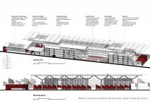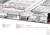 The zoning creates distinct yet interconnected realms: a museum on the left, a linear market on the right, and public green breakout spaces in between. These layers serve not only functional purposes but also act as metaphors: the museum conserves memory, the market redefines livelihood, and the greens create collective breathing grounds. A roof module, generated from the original colonial facade, connects past and present while narrating industrial heritage through architectural form.