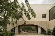 The project is anchored by a reinforced concrete plinth that acts as a solid base, rooting the house within its context. This stone-like mass does not remain static; it fragments and opens into a sequence of arches that establish rhythm and spatial continuity, creating a fluid transition between inside and outside. This gesture evokes regional building traditions, operating as a system of thresholds between intimate and collective spaces, between shelter and landscape.