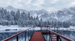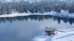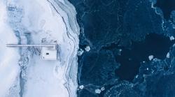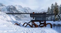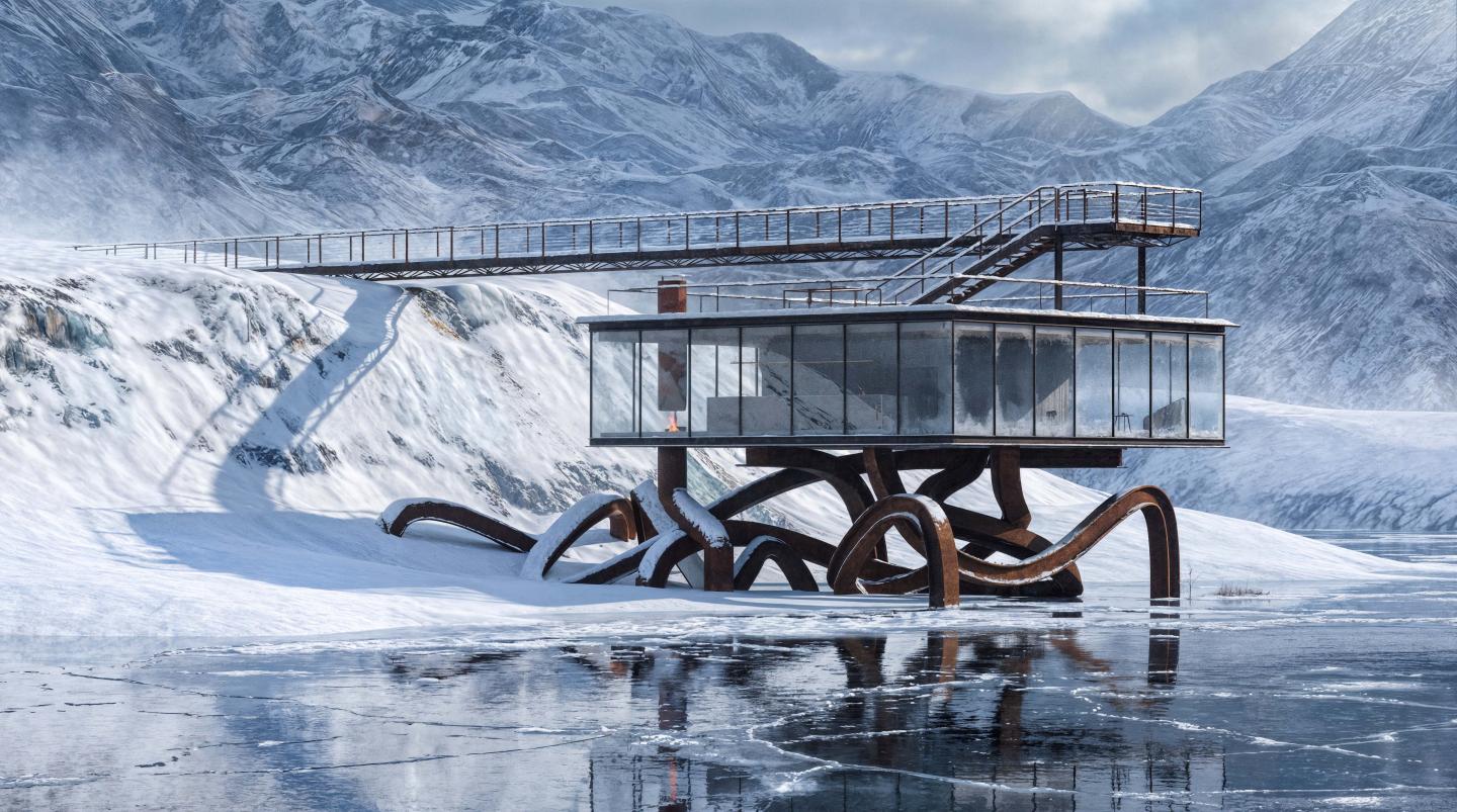 Materiality plays a crucial role in this narrative. The use of weathered steel (Corten) for the structural undercarriage creates a striking visual contrast against the pristine, white winter landscape. The raw, oxidized texture of the metal evokes a sense of resilience and permanence amidst the harsh, shifting snow, grounding the project in a deep, atmospheric materiality.