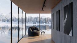 Resting atop this chaotic yet calculated organic base is the upper volume—a pure, minimalist glass box. Designed with minimal boundaries, this transparent volume acts as a serene observatory. It does not obstruct the view but rather frames the panoramic landscape, dissolving the barrier between the interior sanctuary and the exterior wilderness. The living space becomes a platform for witnessing the silence of the snow and the majesty of the mountains.