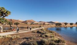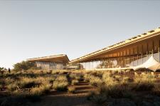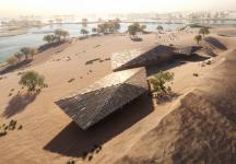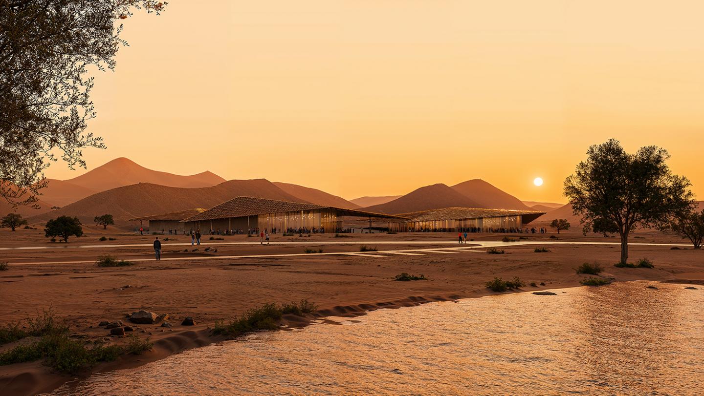 Material choices reflect both aesthetics and practicality – wood-textured aluminium panels evoke a natural feel while ensuring durability and low maintenance; glass enhances daylight and scenic views, strengthening the connection between architecture and nature; and rammed-earth–style modules echo local vernacular architecture, enriching the overall texture and cultural ambience. By incorporating elements from the surrounding landscape, the design achieves a balance between culture and functionality, blending seamlessly with the desert wetlands and nearby dunes.