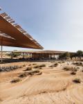The roof design features multiple slopes, with the interior ceiling following the same gradient. Through re-angled and multi-faceted eaves, the design successfully resolves the challenge of constructing double-curved surfaces, resulting in a lighter and more dynamic roofline. To address the region’s hot climate, the building is elevated to create a floating effect. The large overhanging eaves not only enhance energy efficiency but also provide generous shaded areas, offering visitors a cool and comfortable retreat in the dry heat.