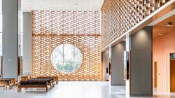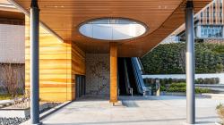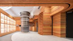 The design is a physical expression of Chinese medicinal philosophy, with Yin-Yang balance and the Five Elements (Wood, Fire, Earth, Metal, Water) informing spatial organization, materiality, and experience. The façade combines articulated aluminium fins, high-performance glazing, and textured GRC panels, while the iconic medicine cabinet (bai zi gui) is reinterpreted as a perforated aluminium “Tao Passageway,” linking interior and exterior circulation.