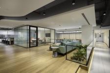 At the core of the layout is an elevated central zone, housing a cluster of fixed meeting rooms and collaborative spaces. A bespoke ceiling treatment and lush vertical greenery mark this as a distinct spatial anchor—visually prominent yet open and accessible. Strategic zoning places full-height volumes toward the centre and edges of the plan, allowing natural light from the east and west-facing façades to permeate deep into the workplace.