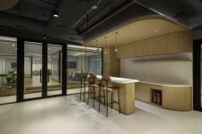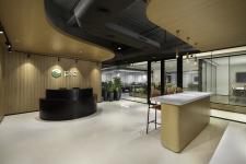 The office opens into a welcoming work café that serves a dual purpose—as a reception zone and informal meeting space. Timber-lined surfaces and a meandering ceiling gesture extend the yin-yang philosophy, creating a fluid and approachable entry sequence that evolves with the rhythm of the workday.