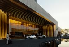 The street-facing interface features a 10-meter-high welcoming porte-cochère and a double-height lobby, showcasing a large-scale vertical spatial design that exudes an embracing posture, warmly welcoming guests from all directions. The layered metal frames of the porch mimic geological formations, harmonising with the transparent glass curtain wall of the lobby to achieve seamless visual integration between interior and exterior areas. This design creates a unique balance of comfort and privacy for visitors. Kevin shares, ‘The flowing form not only responds to the landscape but also conveys an inviting gesture. The design provides a light tension and inclusive warmth for visitors approaching from various directions.’
