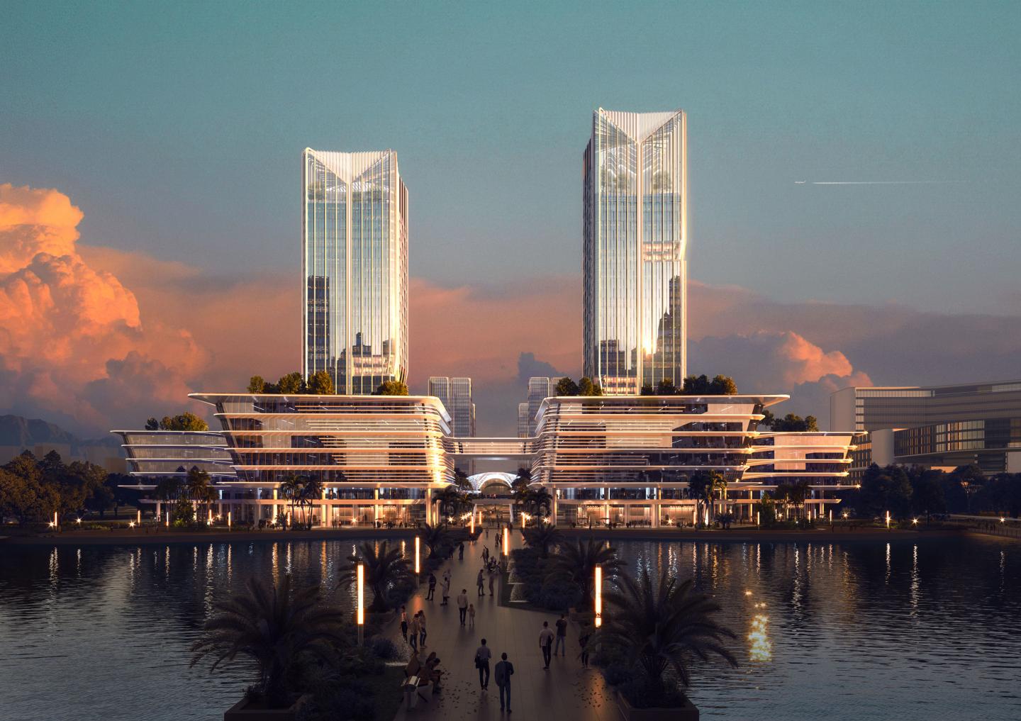 The twin towers feature a range of business facilities, including a sky-level financial lounge with river views and a floating sky garden for relaxation and connection with nature. The Innovation Centre uses a smart modular system, allowing office units to be reconfigured as businesses grow, providing flexible spaces for companies of all sizes and even custom headquarters.