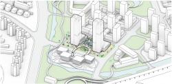 Considering the differences in building density and the city’s overall appearance, the design uses an integrated approach, systematically placing three blocks around the central park. The tallest buildings at the front open towards the sides, complementing the landmark twin towers behind. This layout balances building density and enhances the connection with the park, creating a vibrant urban environment that blends ecology, technology, and culture.