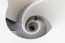 Secondly, all shared semi-public spaces in the building are carefully designed to provide the occupants with both convenience and amusement. The courtyard and half of the ground floor are used for bike and bicycle parking, a spacious spiral staircase nicely accommodates the central area of the building and acts as not only an interesting daily circulation route but also an informal and intimate interactive space. A common sitting area at the mezzanine level and the rooftop terrace are also pleasantly shared by the occupants. Those communal spaces create a sense of community within the group of people who live under one roof.
