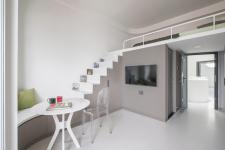 Firstly, six loft-style suites and two standard studios are neatly arranged within the relatively small foot-print of the site. A minimal loft space is placed on top of the entry area and bathroom of each rental suite to maximize the spatial use of the 3.5-meter floor-to-ceiling height and deliver both spaciousness and coziness to the main living space. A neutral material and color palette is proposed while smart-designed and multi-functional furniture such as seating benches, wardrobes, and storage cabinets are harmoniously combined with secondary structural elements including minimal wooden staircases and light-weight floors made of steel frames and standard cement boards.