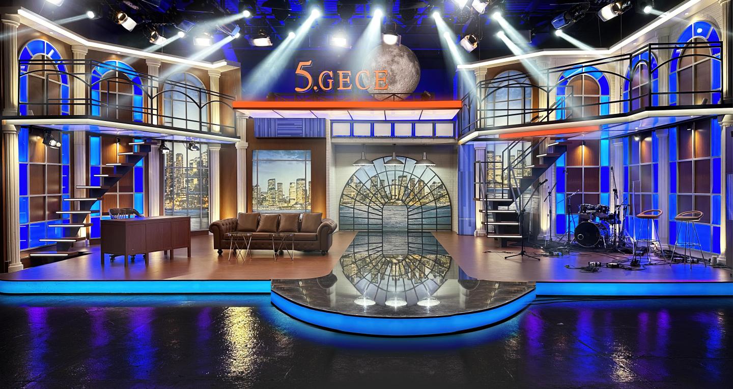Led by architect İrem Arıbaş and interior architect Hüseyin Beş, BAB Architects is a team recognized for successful architectural, interior design, and broadcast design projects in Turkey and around the world. For the television program “Beşinci Gece” (Fifth Night), which aired on Habertürk TV, they created a custom studio design tailored to the show’s unique concept. Combining entertainment, conversation, art, and music, Beşinci Gece offers viewers an unforgettable experience each week with different guests under the moderation of Mehmet Akif Ersoy.