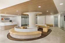 Architecture plays a critical role in communicating SPS Hospitals’ brand values of holistic wellness, vitality, and innovation. The vibrant façade, marked by the bold colours of the SPS brand, stands as a visual symbol of health and hope. Inside, the spatial design guides users through fluid, uplifting forms that reflect the clinic’s core mission of care, aligning with the brand's personality and ethos. The curated colour palette enhances the seamless user experience, which incorporates warm, healing earth tones, evoking a sense of comfort and tranquillity. These elements work in tandem to ensure that each clinic becomes a trusted extension of the SPS brand, delivering consistent, high-quality healthcare experiences across multiple locations.