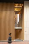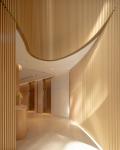 The beige fins seamlessly extend from the exterior entrance to the interior wall, establishing a serene and inviting ambiance that guides visitors into the tower. The entrance is accentuated by an arched ceiling that allows sunlight to pour onto the floor, creating a welcoming and naturally lit environment. The lift lobby continues the design language with matching beige fins and a white ceiling, ensuring a cohesive and unified aesthetic throughout the interiors.