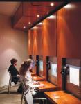open by pivoting flush panels out from cabinet bodies to reveal shelves and monitors. While individual stations are provided with headsets, the group stations need a standard theatrical presentation format. Making them private prompted the staggered layout and the installation of separate overhead canopies, each containing its own focused speaker system.