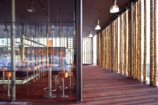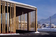 The client asked for a "cool marketplace" - protected from sun and heat. Beside the village, in the midst of meadows, countryside, with a view to the mountains, forests and the wood stacks. Tree trunks, rid of the bark create gaps for a new meeting point on the outskirts.