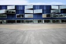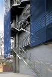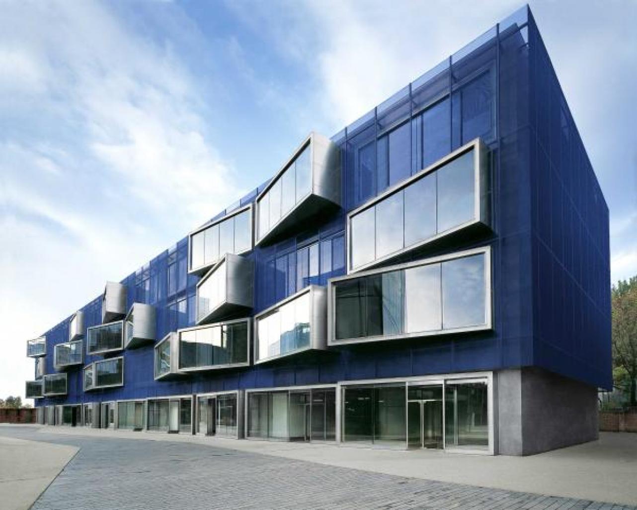 Referencing a building under construction, a layer of blue metal mesh, supported by a cantilevered scaffolding-like structure, wraps around the entire building. Offset from the building, the mesh performs as a second skin buffering the city noise level and filtering direct sunlight for energy efficiency.
