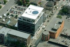 The client for this unique office development for King Street East, in downtown Toronto, requested a “landmark” facility to reinforce its image as an IT service and training provider. A dramatic roof form, which incorporates a circular skylight window makes the building easily recognizable from nearby banking towers, where many of the company’s clients reside. Materials include a combination of metal panels and curtain wall, including vision, translucent and spandrel glass.