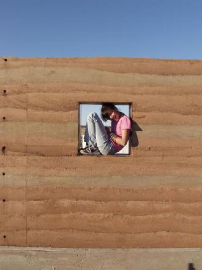 It has a rain water catchment system, rammed earth trombe wall, uses Flexcrete, an autoclaved cmu product, native sticks, reeds and flagstone for finishes.