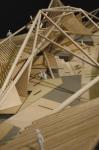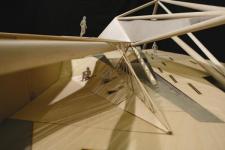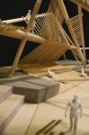 Therefore the deformation is translated into a three dimensional steel truss. The truss has specific geometric attributes which create various spatial relations. It is the moment where the program of the media experience urban park is emerging to fill up these relations. The ethereal character of the spatial relations is underlined with the use of wood as a softer material which is partially embracing the steel truss in order to define exactly the spaces and their relations. The final result is a semi-public space which is engaging a passing by space with the media applications.