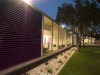 Visible from a major road, the massing and combination of forms balance contextual composition with a striking simple intrusion. Presenting solid walls to the east, north and west facades reduce unnecessary heat load, yet the building provides transparency to the south landscaped portion of the site. This characteristic, in conjunction with a reduction to a scale in keeping with the adjacent residential buildings, fosters visual connection and promotes passive surveillance.