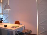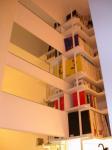 Sometimes projects happen, almost with no effort. This is what happened at the inside of the space of about 28 square metres.The result? A small architecture office and at the same time a place to be isolated: an inside of the inside. An office that when needed can be transformed in a living shelter, a “survival unit” to give oneself, all-nighters or simply to think in solitude. The entire project asks for a hypothesis: designing a house /studio apparently adherent to the needs of the owner, underlining the space character so to make the perception of space discontinuous {and so not granted}. The role of details, in this case, becomes a simple deepening of scale, to verify in some significant points. A detail that is solved with creativity coincident with simple structural elements and home decorating: the centre of the wall that is transformed in a projecting screen when needed, the “door-panels” in all their height that is pierced through by “blades of light ” at sunset, the nearby shelves that continue and reinforce the design, the mirror effects that doubles the decorations and spaces besides following the horizontal lines of the wall shelves, the reading desk that with a fast rotation is transformed into a top {for example for a projector}. At last the accent placed on some functions, for example the paintings made with material designed by architects like Charles & Ray Eames or Verner Panton emphasised in this new use, as to subtract them to a granted dailyness. What prevails is the use of the straight line, synonym of clearness and simplicity, economy, abstraction, the prevalence of bi-dimensional shelves, always strongly accentuated: seven walls, rubber floors, like in public spaces, that increase the sense of border violation between inside and outside. Let alone the central role assigned to light, natural or artificial, with which the projector plays modulating it diffused, soft, in constant dialectic with shadows. But also the abolition of all colours,that derives from the materials themselves, with the prevalence of different tones of white {on the walls like in the works of iron or in the decorations}, from the warm tones of the wood {for example “the pine wood ” in the wall shelves or in the bed space} and the anthracite grey of the floors. A luxury given by the perfection of details.