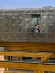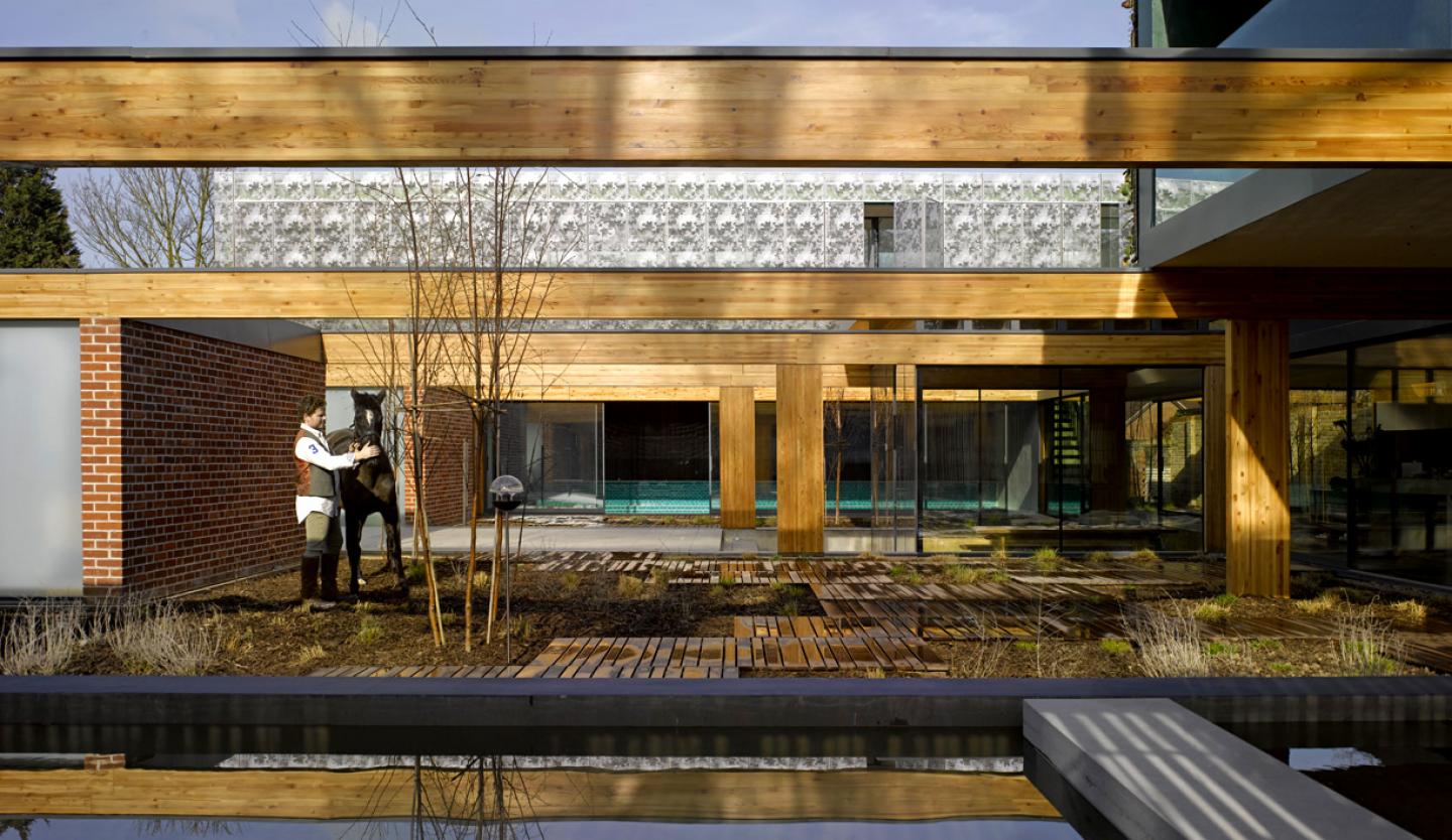 The spaces are arranged around the site to maximise natural light at all times of day, and to set up a central courtyard with a series of satellite courtyards spread around the site. Two volumes sit astride the structural beams at first floor, the master bedroom block sits over the swimming pool facing south, part glazed and part solid it is entirely covered by a veil of stainless steel panels, laser cut with an abstracted foliage design. The other first floor block sits over the main entrance to the house and looks directly into the park, intended as a ‘hide’ it will be entirely covered in foliage all year round.
