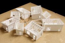 To the great deal of land of 9 ha without any infrastructure in the project, I found myself planning the required rooms, 2 big bedrooms, 3 lecture rooms, 2 offices and a restroom by avoiding such a way as modern zoning which works well in an urban situation. I rather consider that the architecture should be divided into 8 primitive huts and mixed up to a village-like shape as much as possible while they are considered to be functionally related with each other.