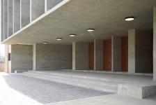 The main usable spaces are insulated from harsh hot climate by the peripheral spaces arranged to act as buffer, like the arrival and pre-function lobbies, vertical circulation core, toilets, as well as back of the house service spaces, thereby reducing the cooling load. The thermal mass of concrete is harnessed to enhance energy efficiency, aligning with the sustainable design principles synonymous with Brutalism. Large windows invite natural light, while functional lighting fixtures prioritize utility without compromising on aesthetics. Architectural fins adorning the entire front façade of the upper floors, impart a stateliness, and fenestrations assure that circulations areas are naturally lit. The verdant front lawn provides a soft touch to the raw monumentality of the built form.