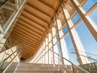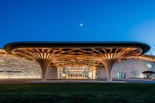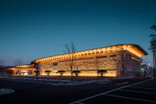 To infuse the clubhouse with a distinctive and culturally significant aesthetic, traditional Korean design elements were thoughtfully incorporated. One of the most striking features is the roof structure, reminiscent of a majestic whale, crafted using Blumer-Lehmann's glulam wooden structure. This design choice lends a sense of grandeur to the clubhouse while paying homage to the architectural heritage of Korea. The roof's graceful slope extends 9.84 feet (3 meters) beyond the building's perimeter, an architectural motif commonly found in traditional Korean roof structures. Further enhancing the visual appeal, the clubhouse's roof is adorned with zinc metal, while the exterior walls showcase a meticulous stone-clad finish. Within the building, the beams, eaves, and rafters are all fashioned from laminated wood, seamlessly merging tradition with modern construction techniques. Inspired by the traditional 'Seokkalae' (rafter) of Hanok, the distinctive pillars and beams were meticulously designed utilizing Blumer-Lehmann's glulam wooden structure. The resulting combination of concrete, steel, and wood not only provides unparalleled strength and stability but also significantly reduces construction time, ultimately yielding optimal results in terms of both construction and economy. The whimsical roof design, evocative of a soaring whale against the sky, exhibits a graceful twist, adding a sense of dynamism to the structure. The outer walls are adorned with a glass curtain wall, creating an illusion of the roof floating above the building, particularly enchanting when illuminated at night.