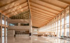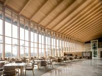 The canopy, supported by elongated wooden spans and minimal structural columns, ingeniously accommodates four drop-off car lanes, seamlessly blending functionality with architectural elegance. To highlight the aesthetic allure of the roof structure, the second-floor locker area was intentionally designed as an open space, allowing the eye to roam freely without visual obstructions. Emphasizing a sense of natural beauty, the architectural finishes feature golden yellow granite stones with a rock face finish, meticulously installed using an 'open-joined' method, further enhancing the overall aesthetic cohesion.