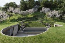 The atrium, which contains a wooden terrace, a pool, and an outdoor kitchen, can be reached using the path under the main living spaces. From here the terrain is lifted towards the garden with planters.