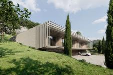 The outdoor yard surfaces follow the terraced »thermal pools« concept and coherently unite with the house and sorroundings. The straight level roof of the house uses greenery fort he same purpose.